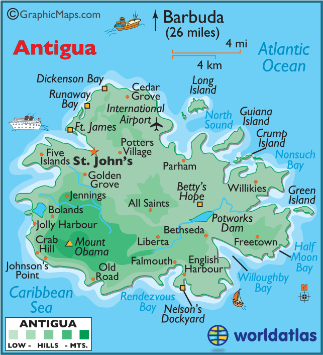 Découverte par Christophe Colomb en 1493, Antigua reçu son nom en l'honneur de Santa Maria la Antigua, patronne d'une église de Séville. Elle est indépendante depuis 1981. Antigua, d'une superficie de 440km², est calcaire et corallienne avec une zone volcanique. Bordée de superbes plages le long d'une côte découpée, elle offre de magnifiques abris. les récifs coralliens rendent la navigation difficile tout en abritant quelques baies ouvertes sur l'Océan Atlantique.